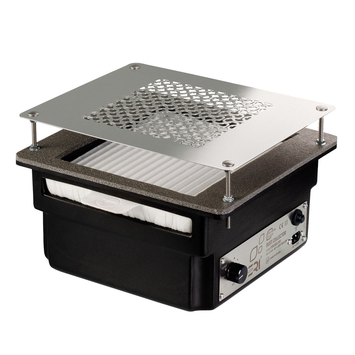 La coque du dépoussiéreur à clous Teri 800 est en plastique ABS avec des éléments en acier inoxydable et en aluminium anodisé. La taille compacte et l'énorme puissance de l'appareil en font un choix idéal pour les manucures. Tous les composants électroniques sont enfermés dans un boîtier en plastique.